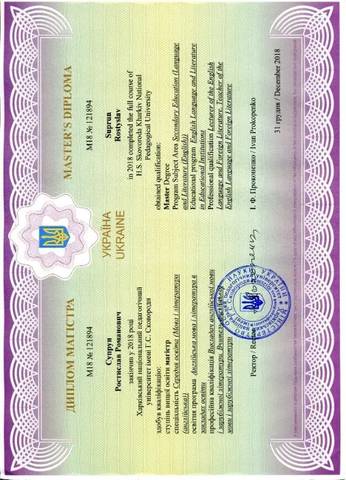 Сам закончил магистратуру Менеджмент ВЭД, НТУ "ХПИ", а так же магистратуры Английская и Русская филология ХНПУ имени Г.С. Сковороды. Работал в Харьковском Горсовете в департаменте международного сотрудничества.