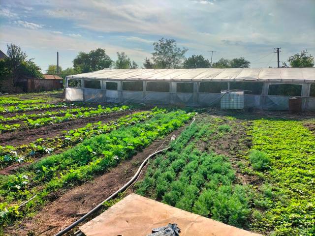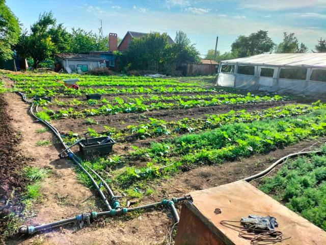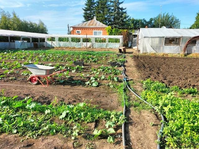 Три теплицы на участке, одна из них 40х12 метров, весь огород оснащен капельным поливом.