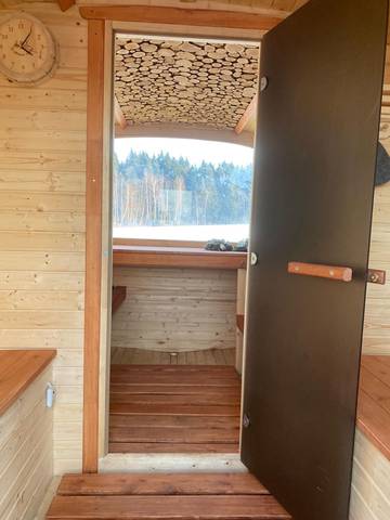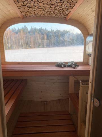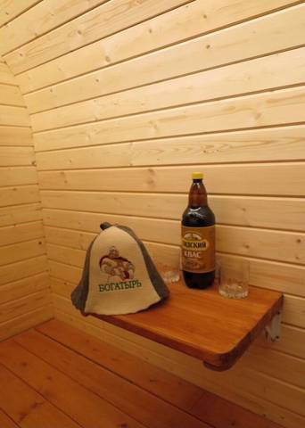 Баня комфортна для одновременного парения в ней до 4-х человек. Комната отдыха оборудована рундуками и двумя откидными столиками. Парная с большим панорамным окном, можевелловым потолочным панно и светодиодной подсветкой. В парной 2 бака для воды: на 55 литров горячей и на 80 литров холодной.
