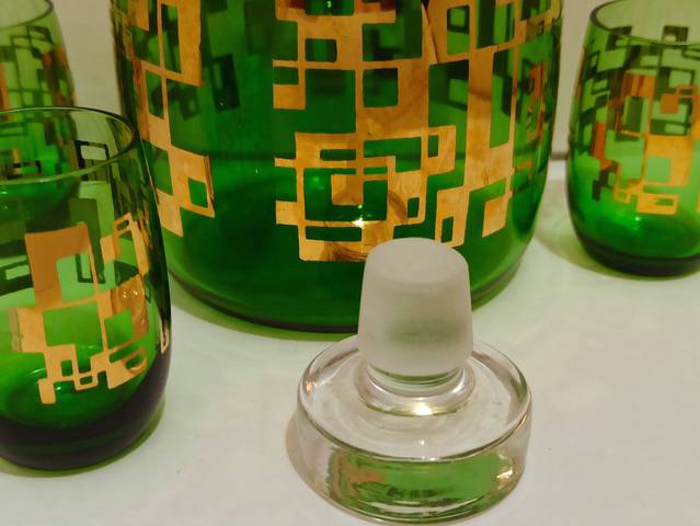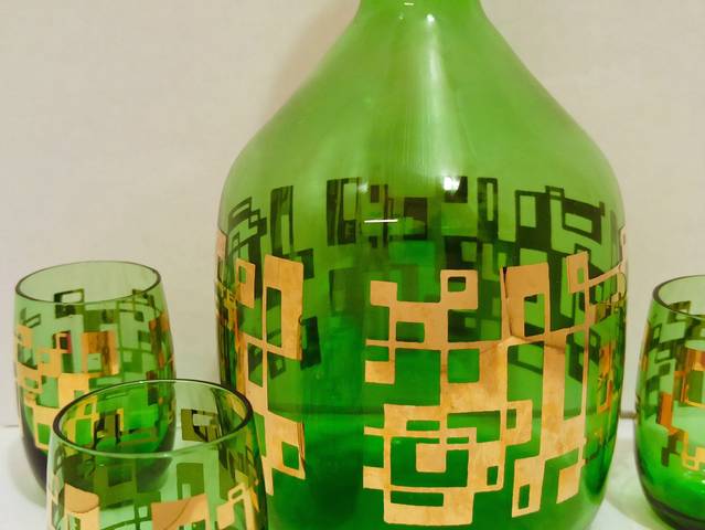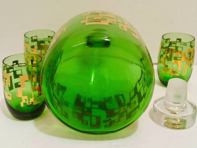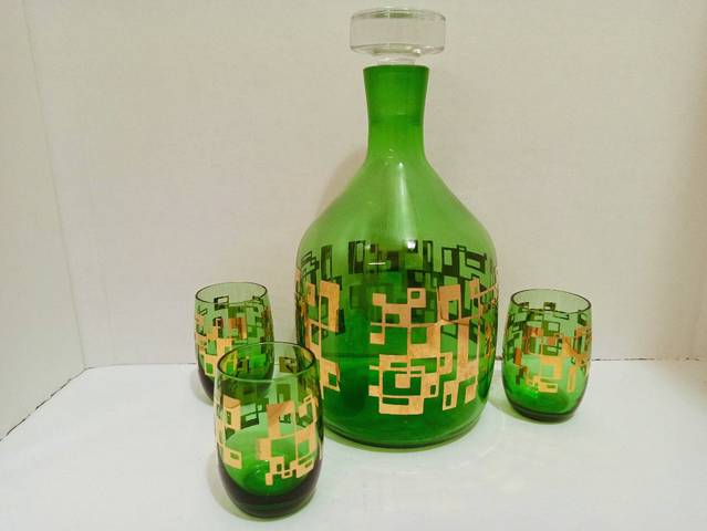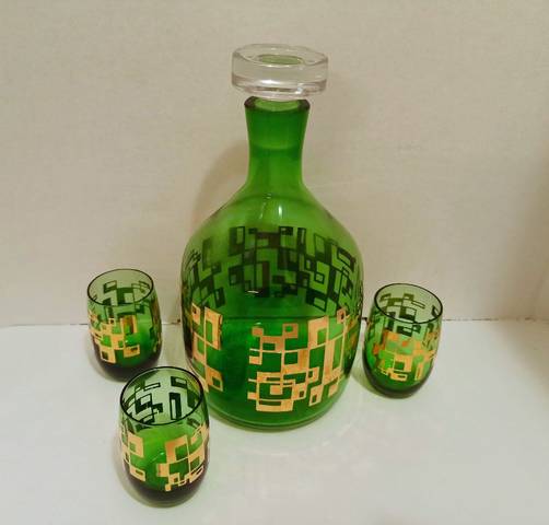 Набор для подачи крепких напитков (абсента, водки и т.п.) на 3 персоны, украшенный геометрическим декором, цветное стекло, золочение, Bohemia Crystal (Bohemia Glass), Чехословакия.