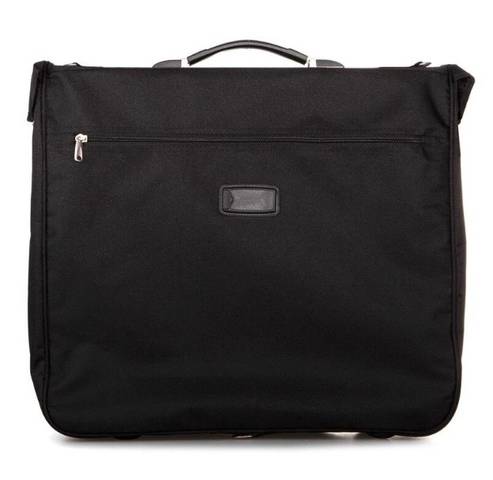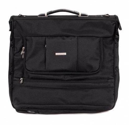 Портплед выполнен из плотного текстильного материала черного цвета и дополнен серебристой металлической фурнитурой. Модель застегивается на двойную молнию, внутри, под молнией, отделение для одежды с креплением для вешалки и дополнительными фиксирующими ремнями. Снаружи вместительные накладные карманы на молнии.