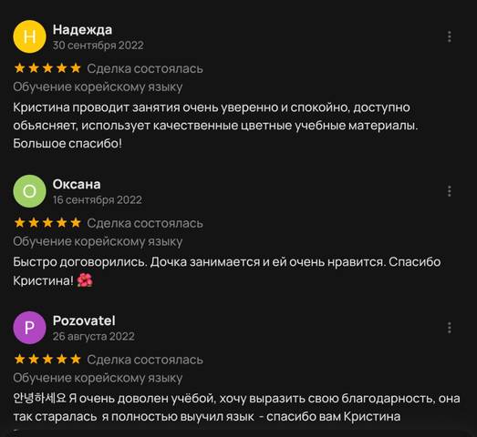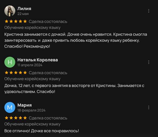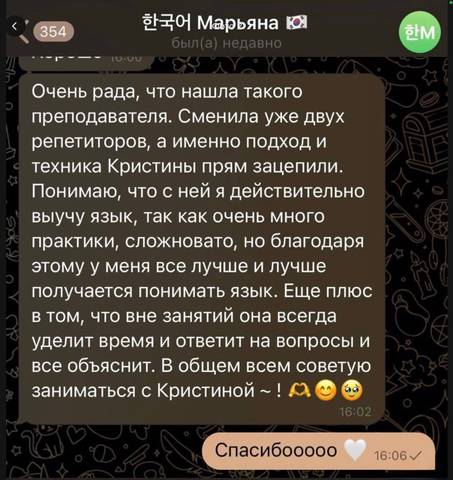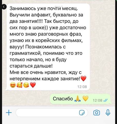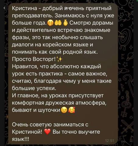 Ищу учеников, которые искренне горят желанием изучать корейский язык и готовы вкладывать усилия. Очень важно подходить к выполнению домашних заданий ответственно и регулярно учить новые слова. Моя роль — не просто преподавать, а направлять и вдохновлять вас на успех. А всё остальное — это ваши старания и желание развиваться!