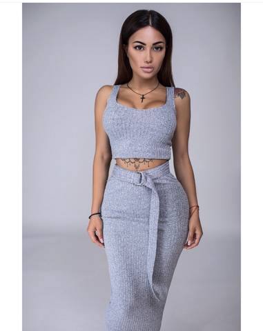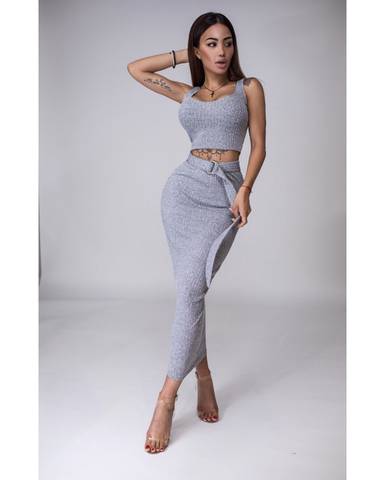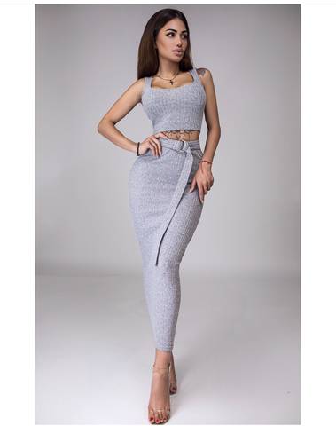 Блестящий брендовый серебряный костюм от Remotamente8 из кроп топа и длинной облегающей юбки на резинке с поясом, ткань с люрексом. Юбку можно опускать либо поднимать, чтобы был закрыт живот, будет выглядеть как платье.