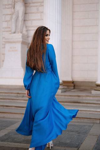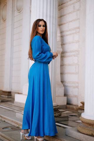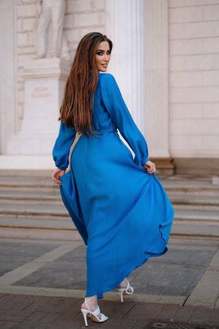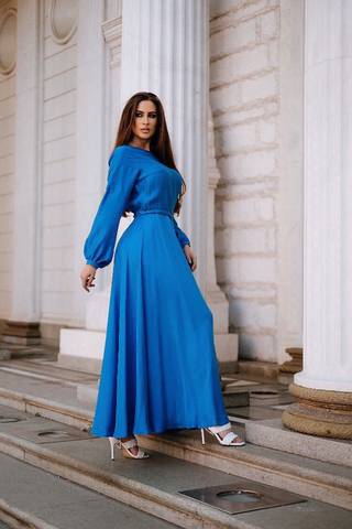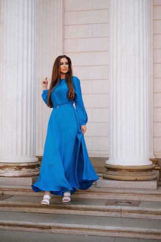 Длинное платье в ярком синем цвете привлекает внимание каждого, по достоинству оценивается от детей до мужчин и женщин разного поколения. Это дизайнерское синее платье подарит Вам уверенность и чувство собственного достоинства. Простой фасон с летящим силуэтом и небольшим поясом подчёркивает фигуру.
