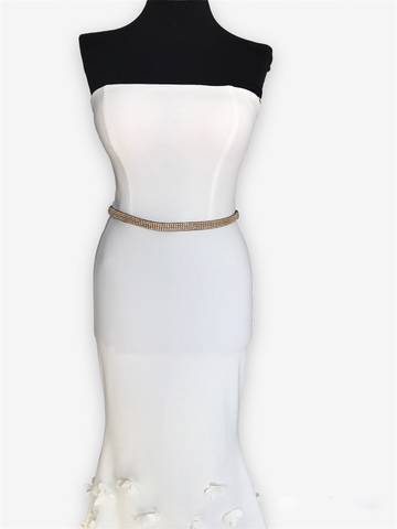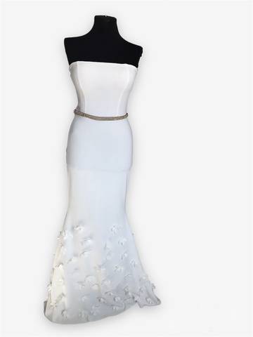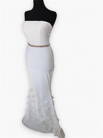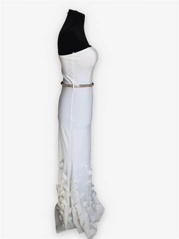 Нежное и красивое белое платье в пол без рукавов и лямок, которое очень красиво сидит по фигуре. Подол платья украшен белыми цветами,