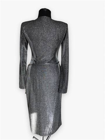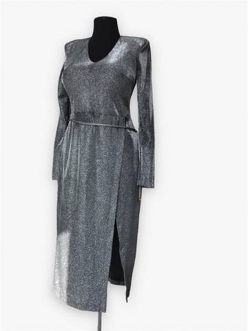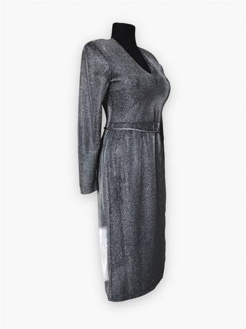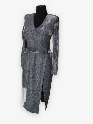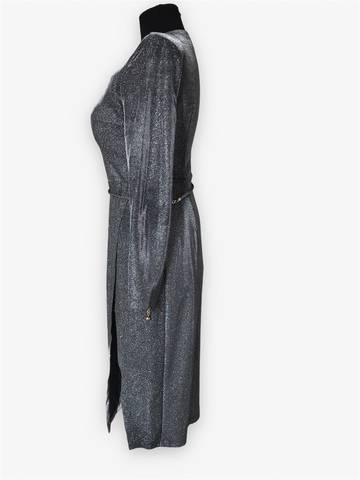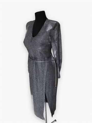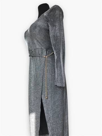 Стильное блестящее серебряное платье с разрезом сбоку. В комплекте идёт поясок на цепочке-регуляторе по талии.