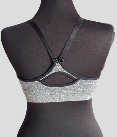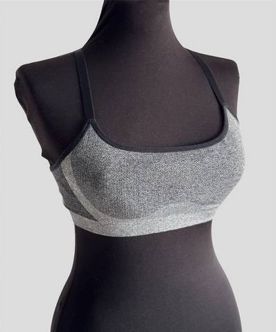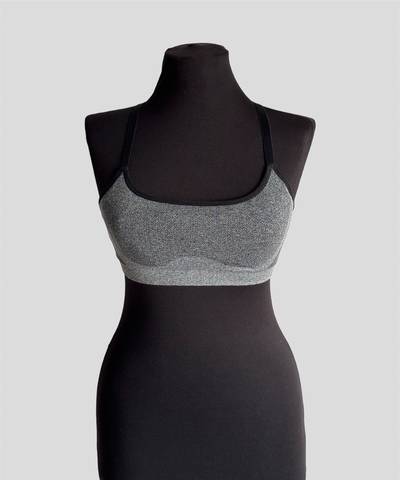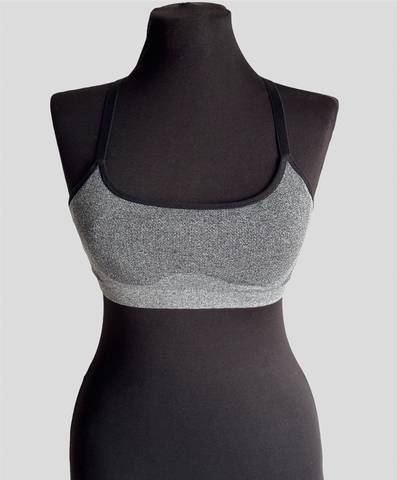 Спортивный серо-чёрный бюстгальтер с тонкими чашечками без косточек, отлично держит грудь.