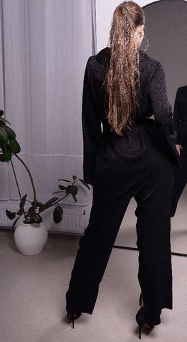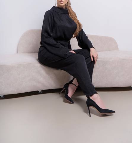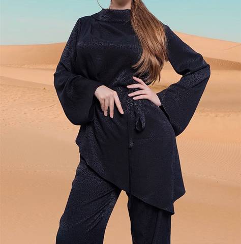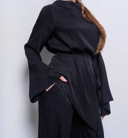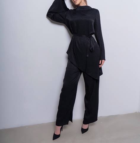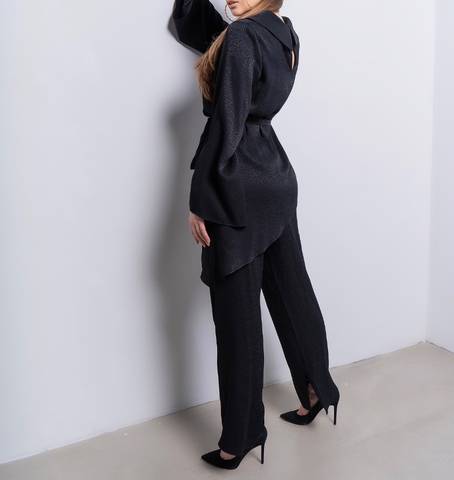 Костюм состоит из свободной асимметричной туники с поясом и брюк на высокой посадке на резинке с боковыми разрезами у щиколоток.