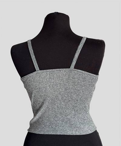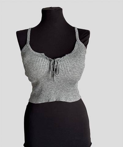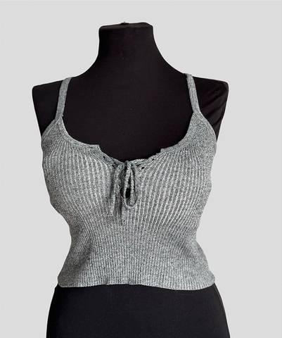 Короткий топик с вырезом и шнурками в районе груди на лето в сером цвете. Ткань тянется.