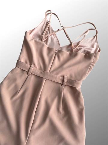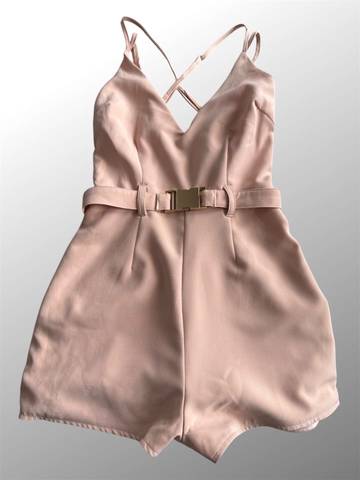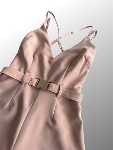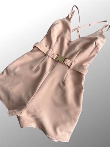 Модный персиковый комбинезон с лямками на лето с поясом на золотой металлической застёжке.