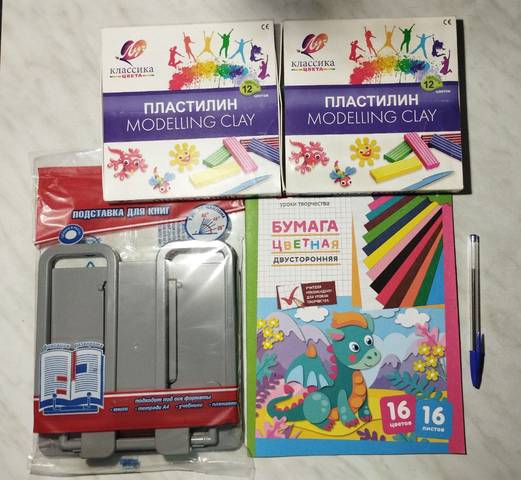 Всё новое. В наборе: 2 пластилина, подставка для книг, цветная бумага и ручка 350р. Передам в ц.в.